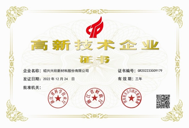 紹興興欣新材料股份有限公司成立于2002年06月27日,占地面積122畝,位于杭州灣上虞經(jīng)濟(jì)技術(shù)開發(fā)區(qū)拓展路2號,現(xiàn)有職工200余人,專業(yè)技術(shù)人員50余人;博士、碩士研究生30余人組成的一支知識型、專業(yè)化的技術(shù)科研團(tuán)隊(duì)。公司面向全球市場,專業(yè)開發(fā)電子化學(xué)品、環(huán)保化學(xué)品、醫(yī)藥中間體、高分子材料等先進(jìn)新材料重點(diǎn)領(lǐng)域的省級科技型企業(yè);建有浙江上虞、安徽東至兩個生產(chǎn)基地。目前為“國家高新技術(shù)企業(yè)”、浙江省“隱形冠軍”企業(yè)、浙江省專精特新中小企業(yè);建有“省級”研究開發(fā)中心,共建天津大學(xué)浙江紹興研究院電子化學(xué)品研發(fā)中心。